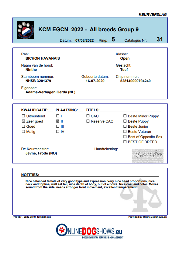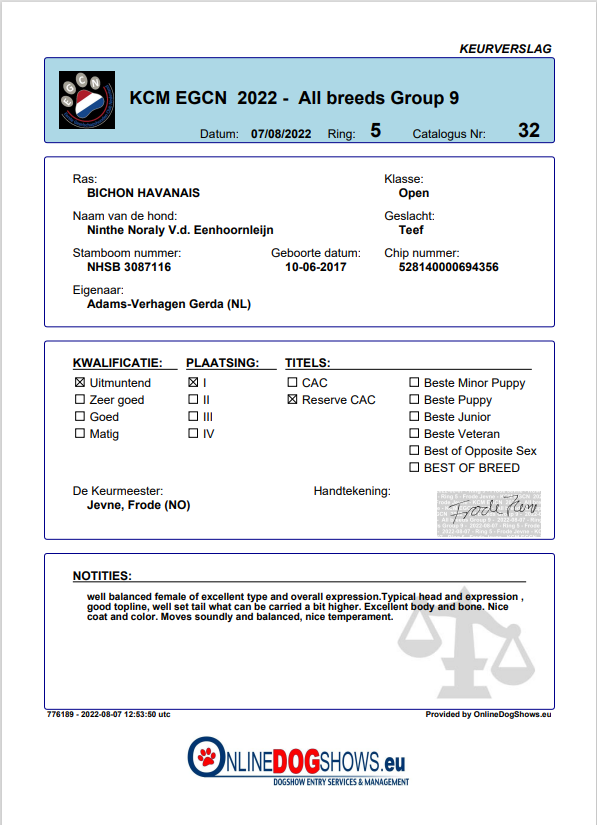 Ik had zowel Lucky als Ninthe in geschreven. Voor het eerst naast elkaar in de zelfde klasse. Dit betekende dat niet alleen ik maar ook Evert de ring in moest. Evert met Ninthe en ik met Lucky. Het ging echt super goed en we hadden een leuke keurmeester uit Noorwegen. Hiernaast staan de keurverslagen weer. Lucky won haar klasse en mocht het reserve CAC ontvangen.