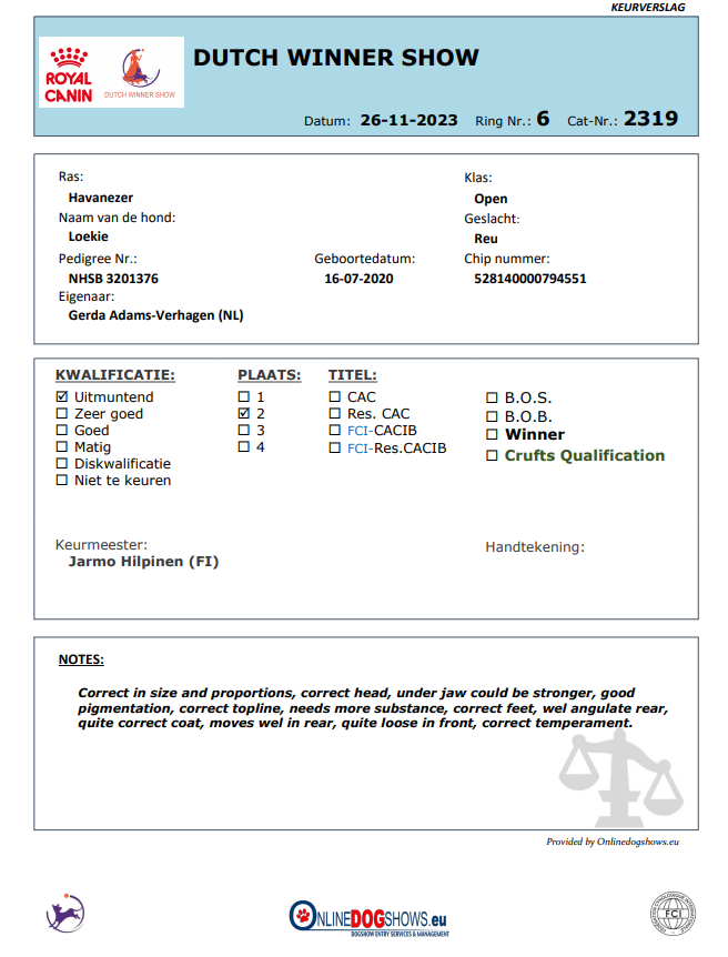 Ik heb onze Loekie ingeschreven voor de Frysland Cup en de Winner en wat heeft hij het super goed gedaan. Ik snap nog niet hoe we het voor elkaar hebben gekregen maar Loekie werd bij de Frysland Cup beste reu van het ras en bij de Winner ging hij met een U2 in de openklasse naar huis.